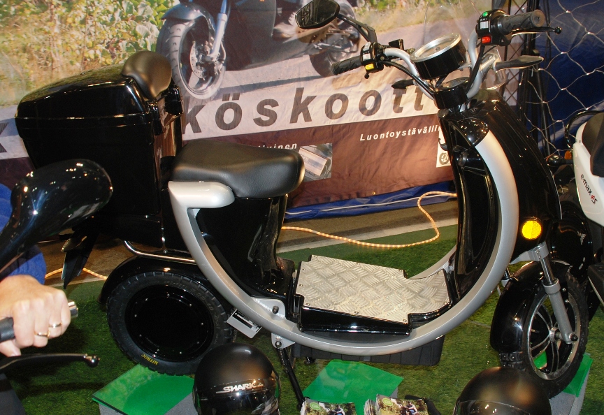 Vaajakoskella toimii yritys nimeltä AAS. Se tuo maahan erittäin laadukkaita saksalaisia e-Max sähköskoottereita. Virtasen Keijo ja Pörstin Leila viihtyivät tällä osastolla varsin pitkään. Tarjolla oli kolme erilaista mallia, jotka kulkivat yhdellä latauksella 40-90 kilometriä. Aika hyvin. Jos haluat lisätietoa, katso nettisivut osoitteessa www.emax.fi