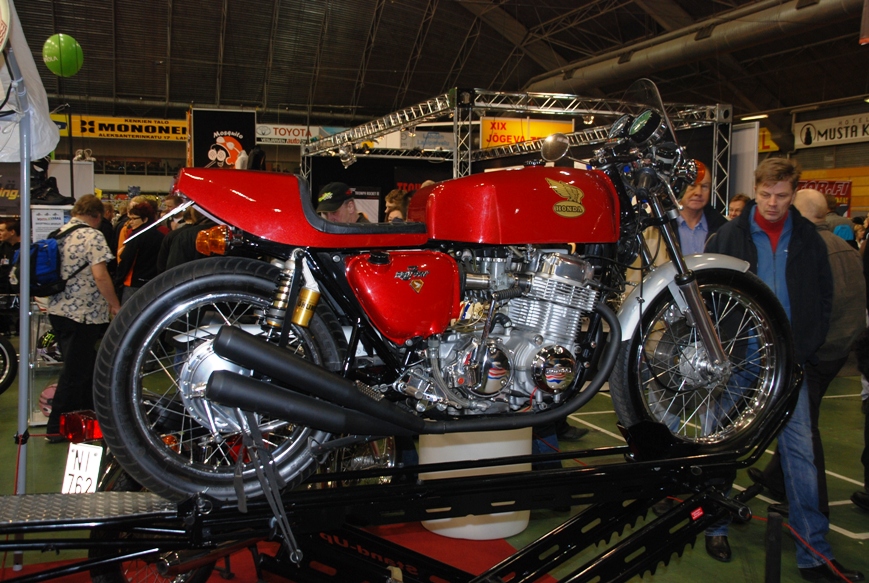 On tätä kuvaa tuijotettu pienenä poikana. Aivan uskomattoman hienosti rakennettu pyörä, kuvattu muistaakseni Kontiorallissa. Kypäräkin maalattu pyörän kanssa sävy sävyyn. 70-luvun alussa ehdottomasti suosituimmat ja yleisimmät prätkät olivat juuri Suzuki T 250 ja Honda CB 350. Niihin oli aika monella rahaa, isommat pyörät olivat suurimmalle osalle vain unelmia. Itse ostin vuonna 1973 Yamaha AS 3:en. Klikkaa Suzuki isommaksi Kävimme Lahden MP-Näyttelyssä Keski-Suomen Konepyöräseuran porukan kanssa lauantaina 6.2.2010. Kymmenen jälkeen pääsi vielä käytävillä kulkemaan, mutta puolen päivän aikaan kaikki oli tukossa. Jonot käytävillä pysyivät liikkumattomina jopa puoli tuntia! Ulkona sisäänpääsyä jonotti satoja ihmisiä. Suosio oli ylittänyt järjestäjien odotukset täysin. Mutta näyttely oli kaikin puolin mielenkiintoinen, harmi vaan kun porukkaa oli liikaa….