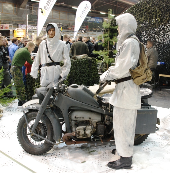 Tuossa kuvassa on sota-Zyndapp, josta olen tehnyt pienoismallin (Esci). Siinähän on pakokaasulämmitys jaloille ja käsille, sillä ohuet kaasuletkut on johdettu sopiviin paikkoihin ja mm. sivuvaunun jalkatiloissa on putkisto lämmittämässä kyydissä olijan jalkoja – savut tulevat ulos pienestä töttöröstä sivuvaunun kyljestä.