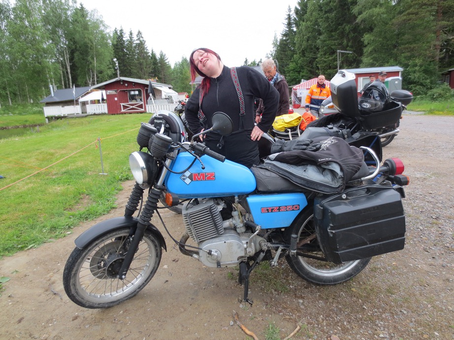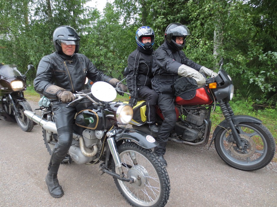 Lähdössä perjantai-illan sateessa kohti Huopanankoskea. Ilkka Lehtosen MZ Baghira Forest varustettuna Orliebin sivulaukuilla.
